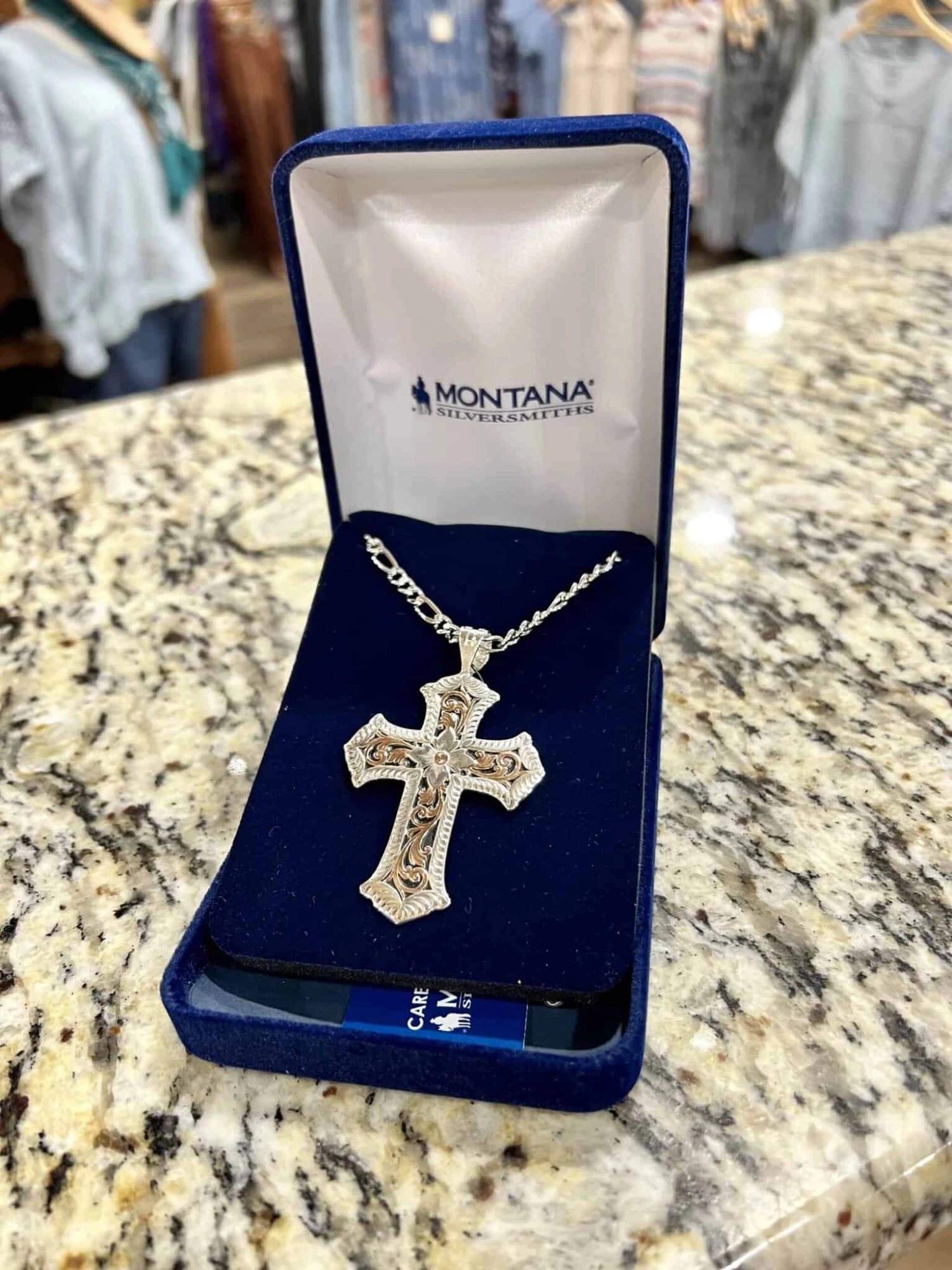 The stunning filigree on this antiqued silver and rose gold finish cross is sure to draw many compliments. The center fleurette and etched edging in silver filled with scrolling leafy pattern through each arm in rose gold is graceful and pretty, popping against a hand antiqued background that highlights its symmetrical beauty. This necklace is destined to be a favorite for men and women. The pendant hangs on a matinee length 22 inch Figaro chain.
