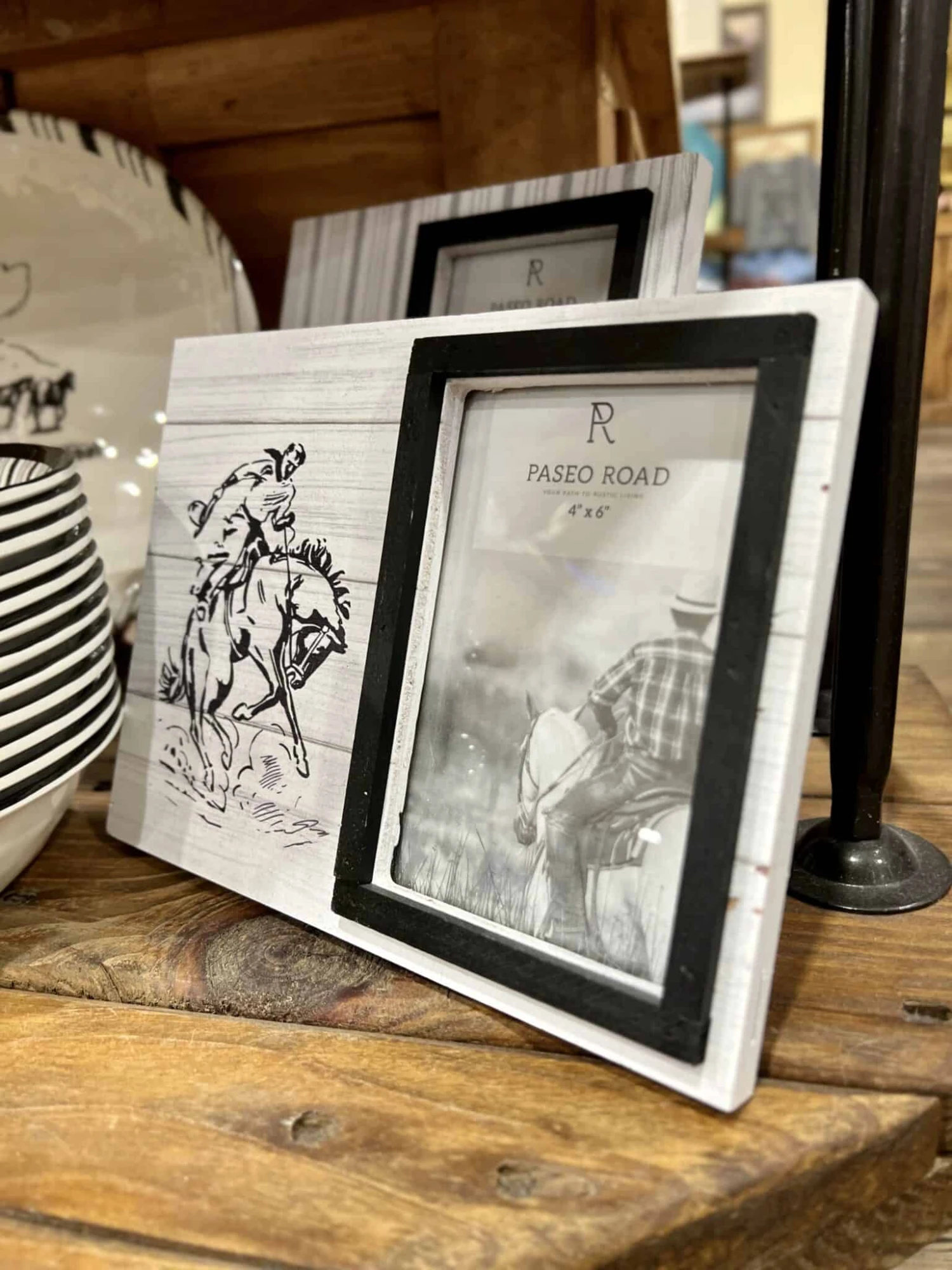 Add a charming Western touch to your precious moments with our Ranch Life Picture Frame. Crafted with durable wooden frames, this picture frame showcases a bucking bronco motif in a black-and-white colorway. It comes with swing tabs on the back for easy installation and a thick glass cover to protect your pictures.