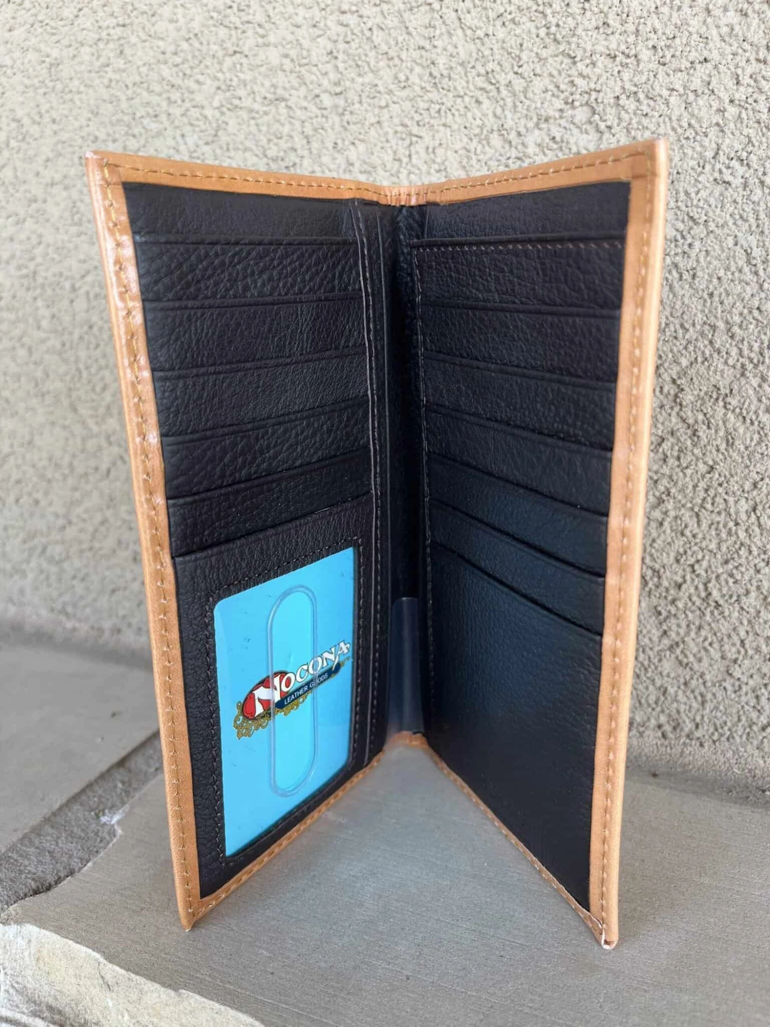 Royal Blue Inlaid Saddle Tan Tooled Rodeo Wallet